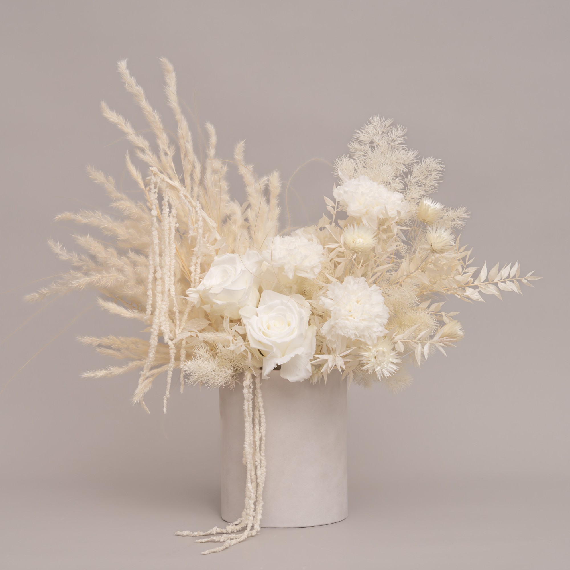 Eternul Alb – aranjament cu flori criogenate, simbol al rafinamentului și al frumuseții fără sfârșit. Rezistă ani întregi.