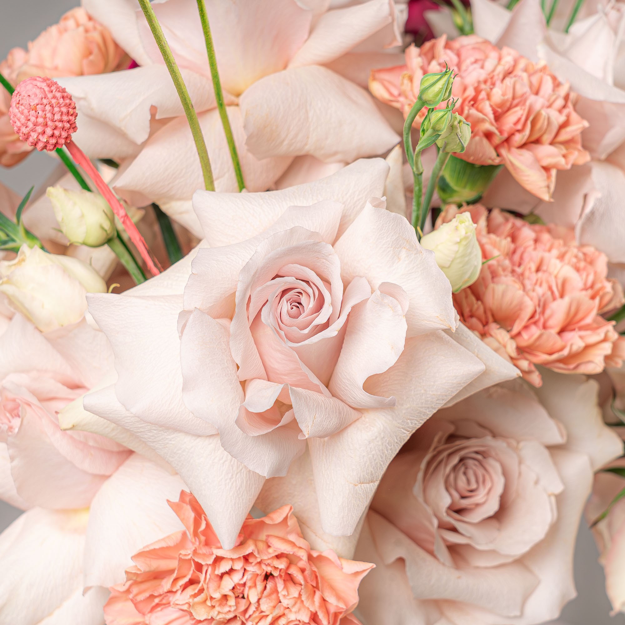Compozitie:13 trandafiri quicksand,9 dianthus,3 lisianthus, 3 scabiosa, cutie catifea 12*12, alte materiale.