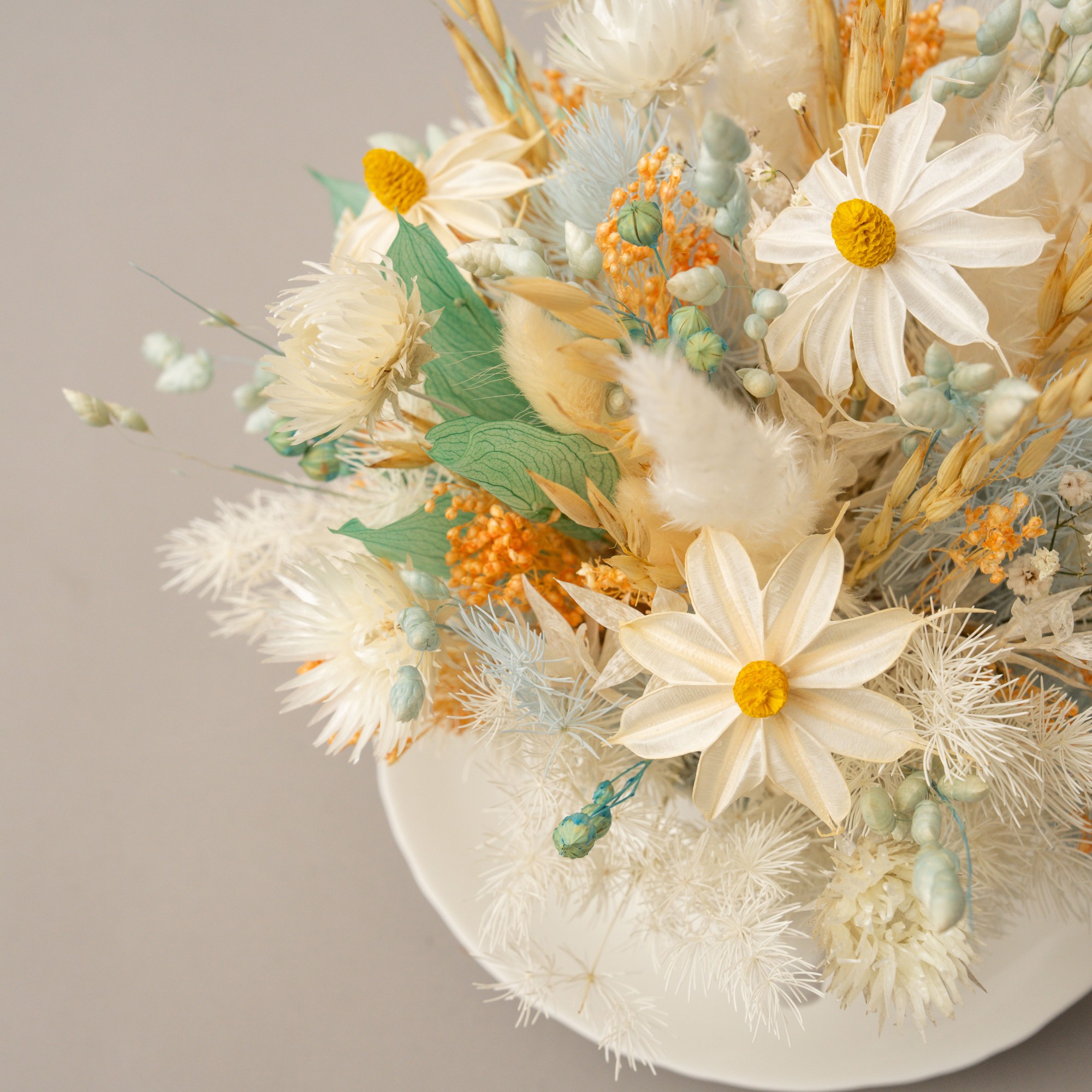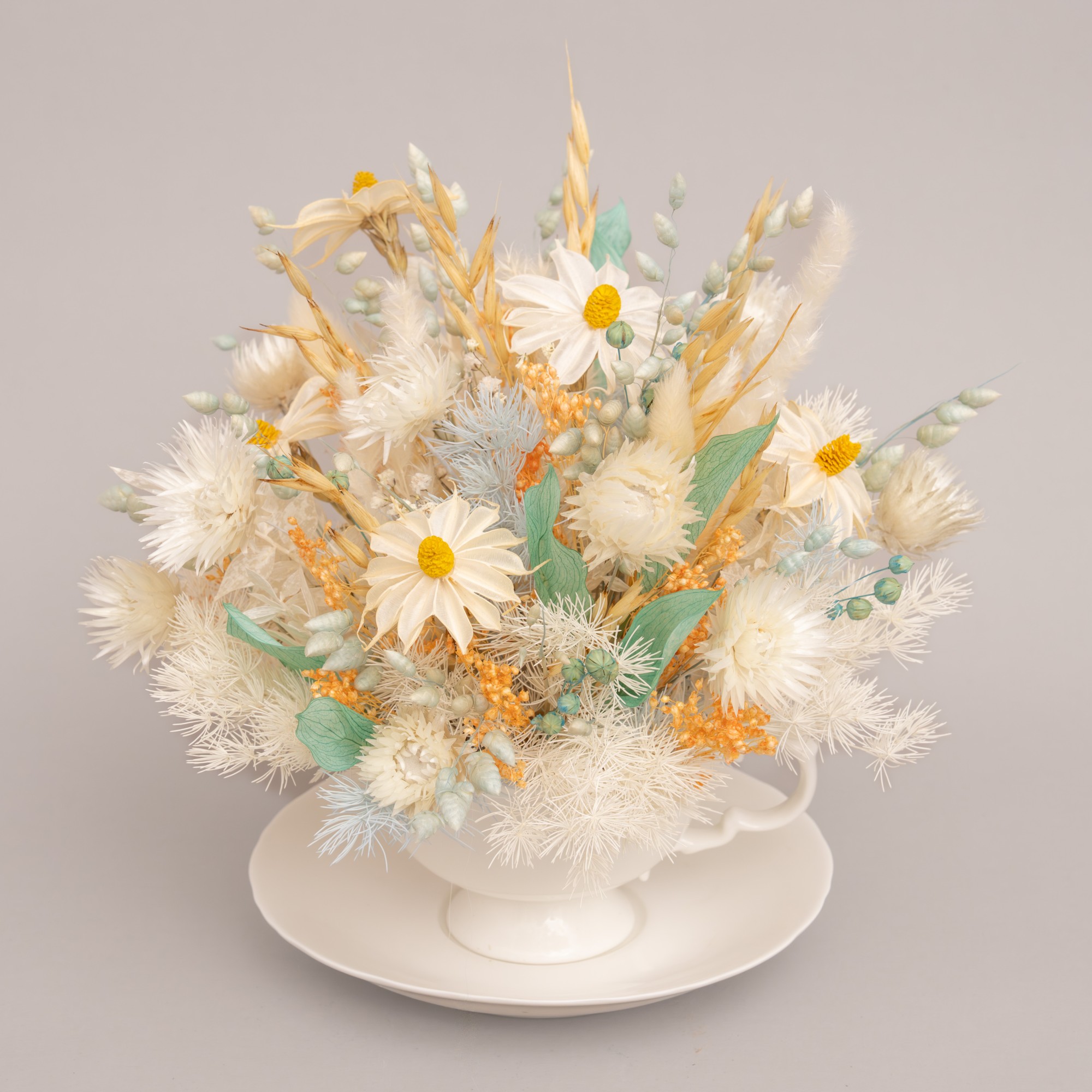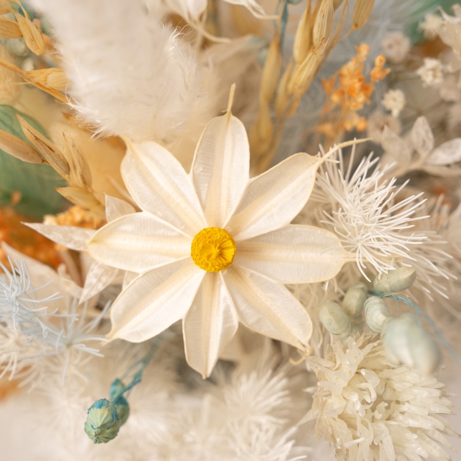 Compozitie: flori si plante uscate si stabilizate in tonuri de alb, bleou si auriu, cescuta alba portelan, alte materiale. Se livreaza in punga cadou.