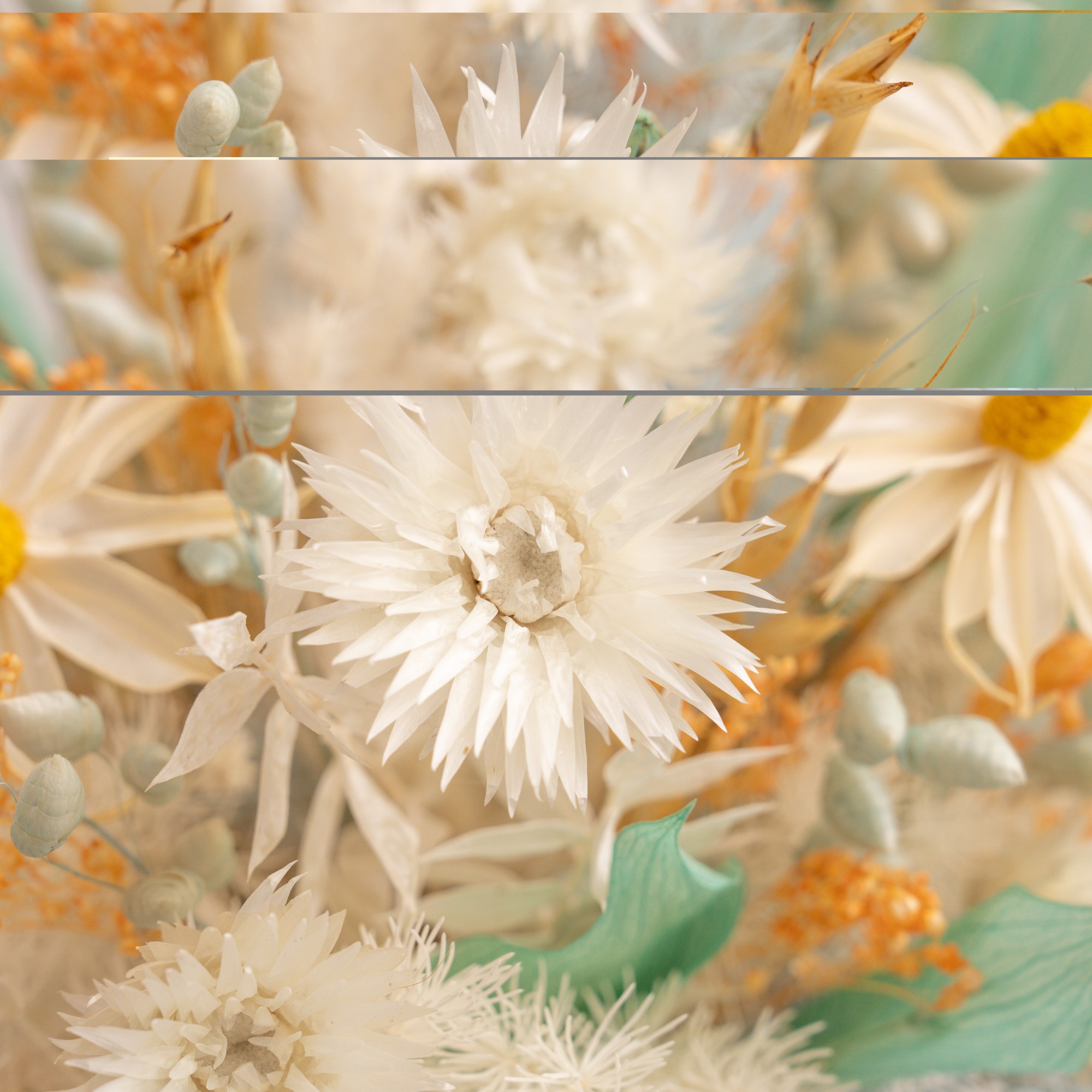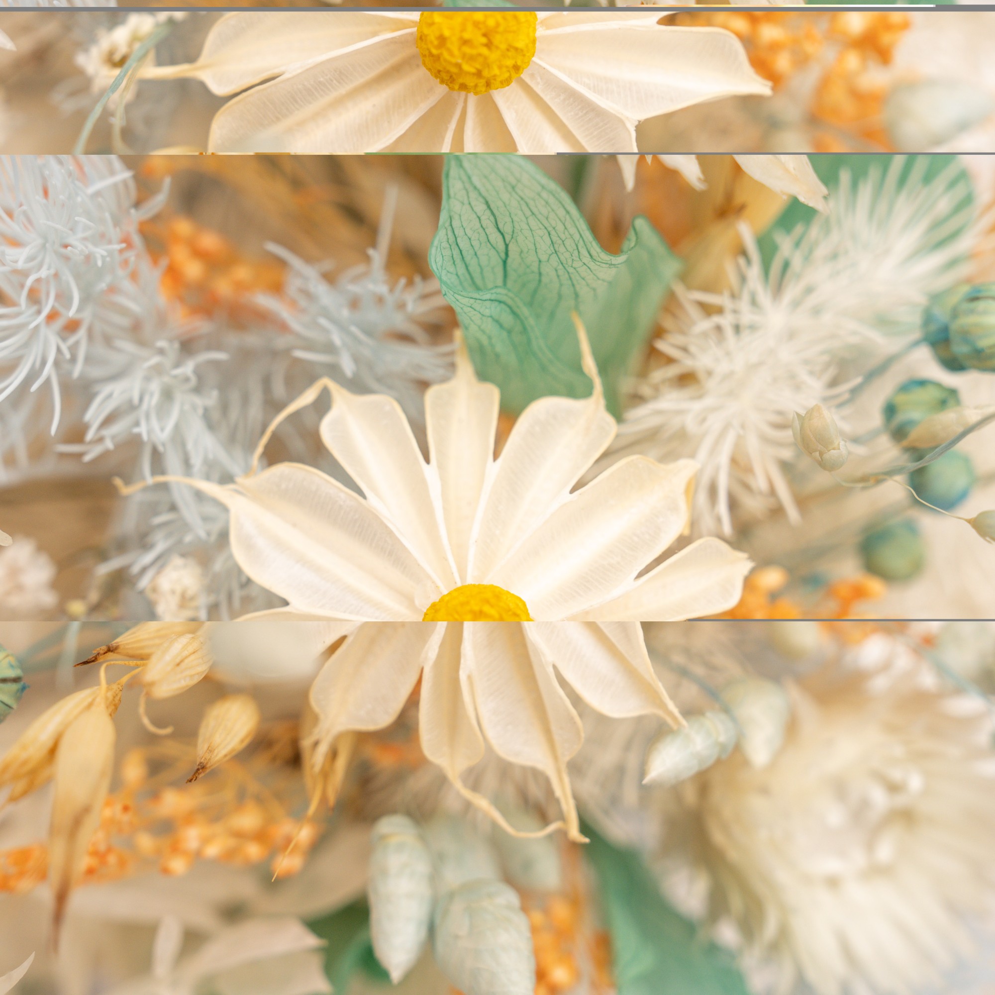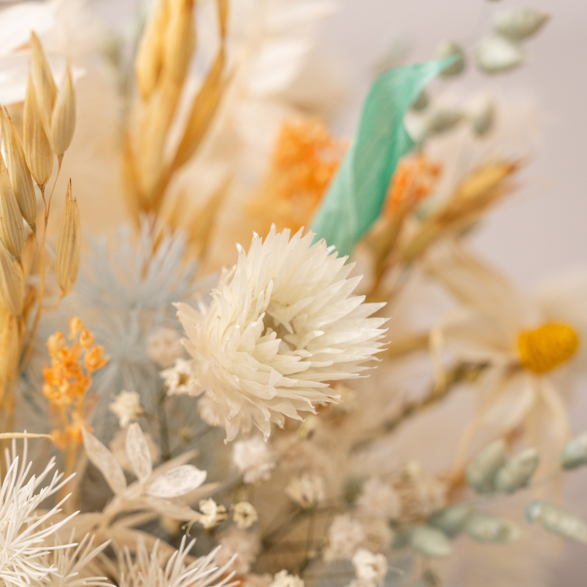 Compozitie: flori si plante uscate si stabilizate in tonuri de alb, bleou si auriu, cescuta alba portelan, alte materiale. Se livreaza in punga cadou.