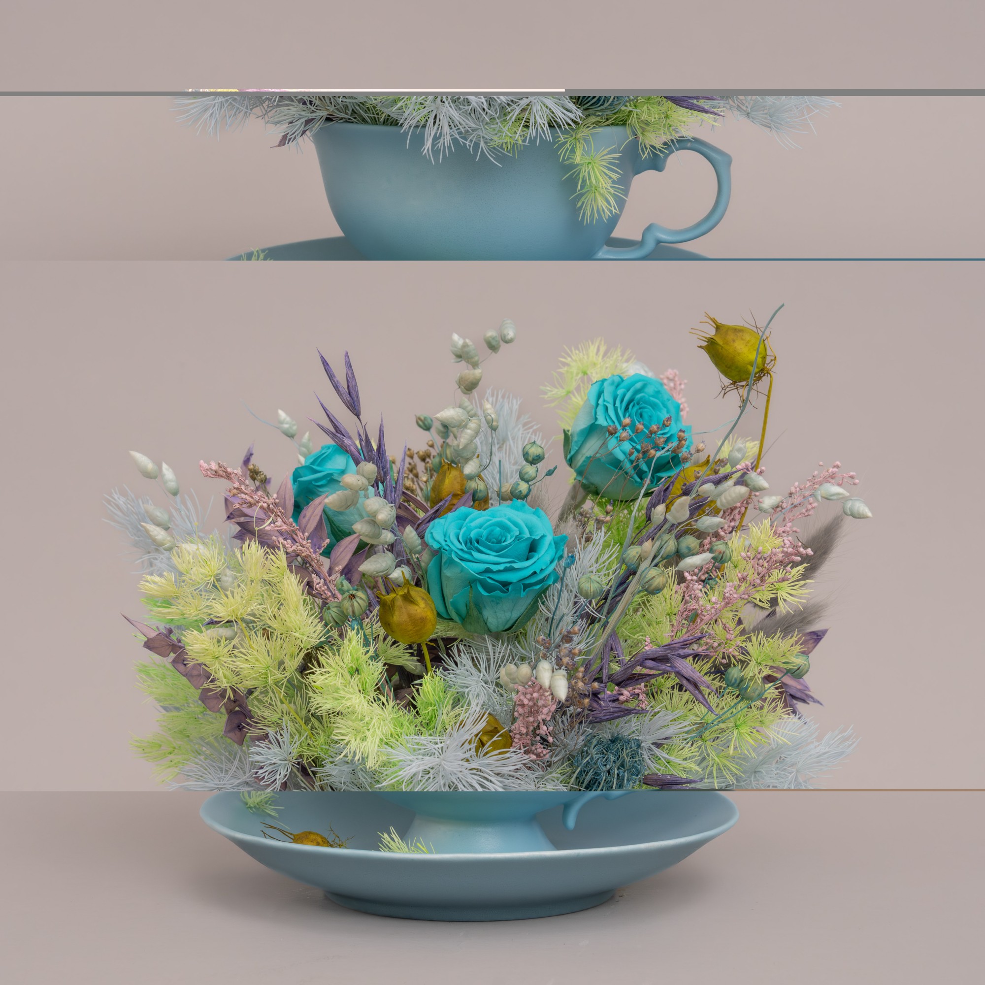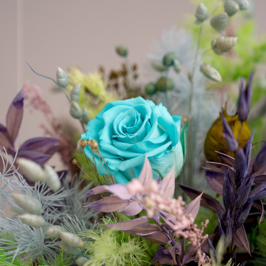 Compozitie: flori criogenate, plante uscate si stabilizate in tonuri de bleou, verde, mov si roz, cescuta portelan vopsita in ton, alte materiale. Se livreaza in punga cadou.